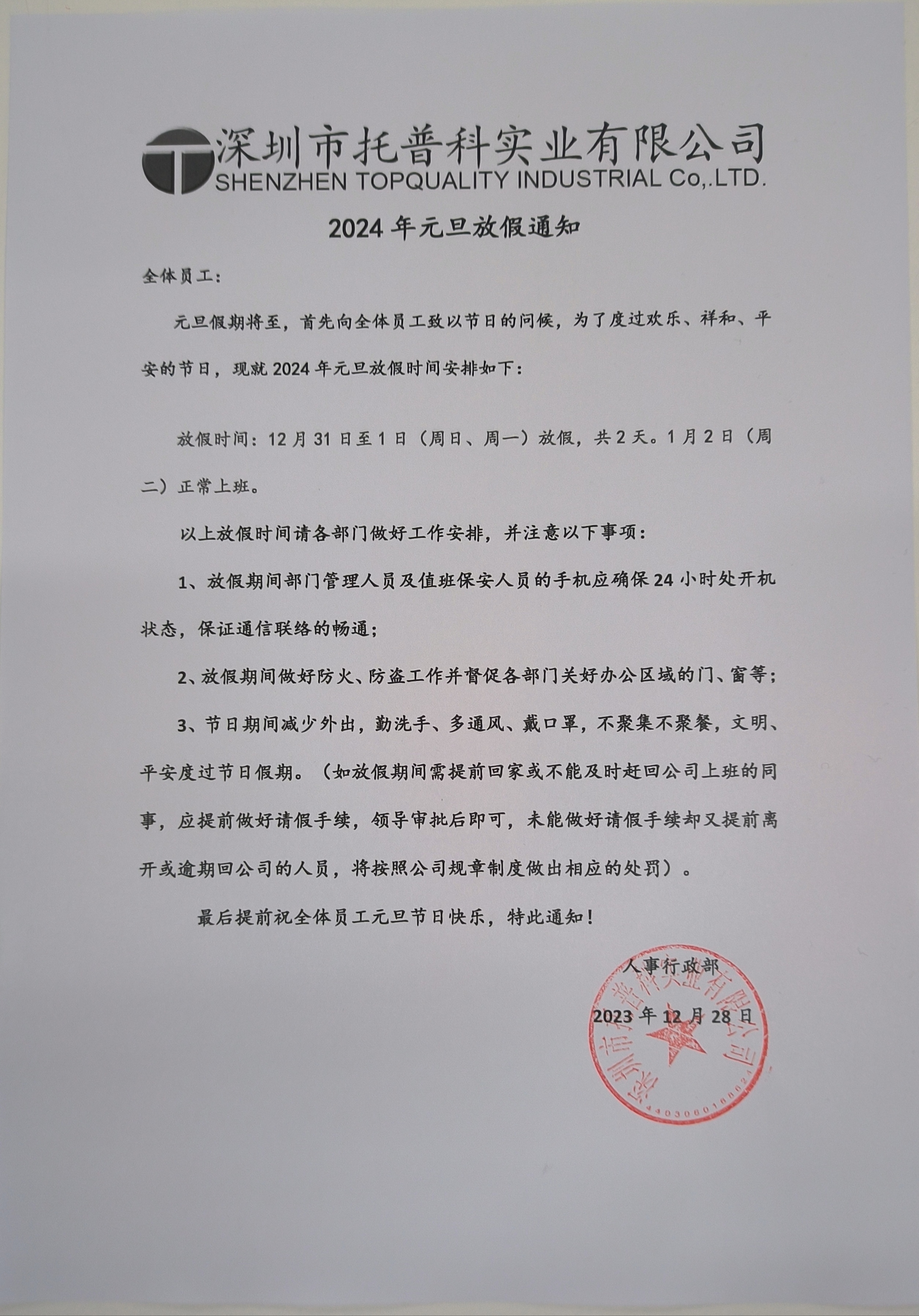 深圳托普科實業2024年元旦放假通知